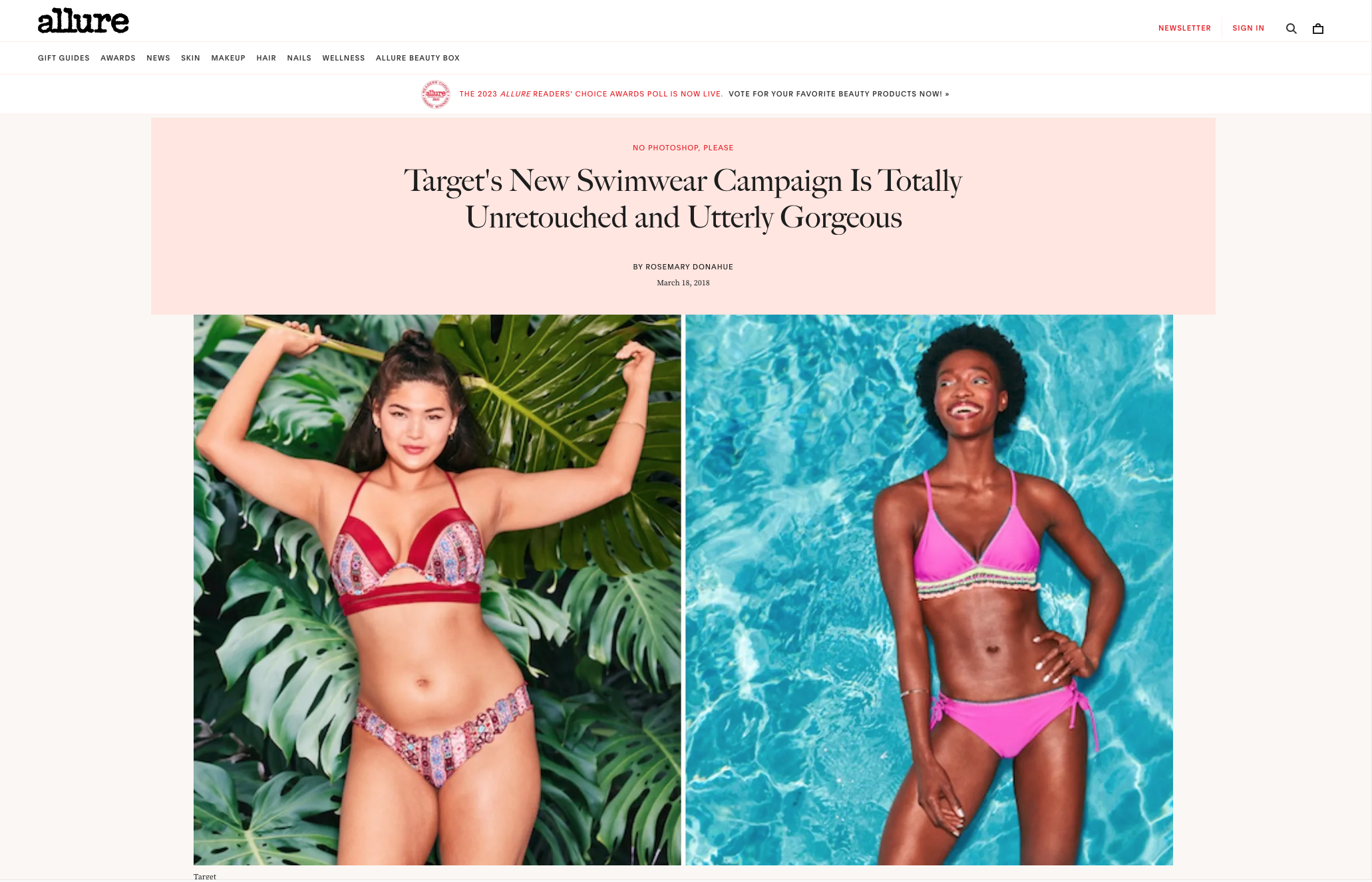 Target announced their in-store launch swimwear collection that consisted of 1,700 different styles. In addition to the numerous designs available, Target removed the stress out of swimsuit season and brought joy back to the beach by providing a social campaign that was relatable to every beach-goer. The campaign highlighted an assortment of swimwear for all sizes, meant to inspire everyone to have fun while rocking their favorite swimsuit. To further body positivity, absolutely no retouching was done throughout the campaign to celebrate women and encourage them to embrace the beauty of their own bodies.